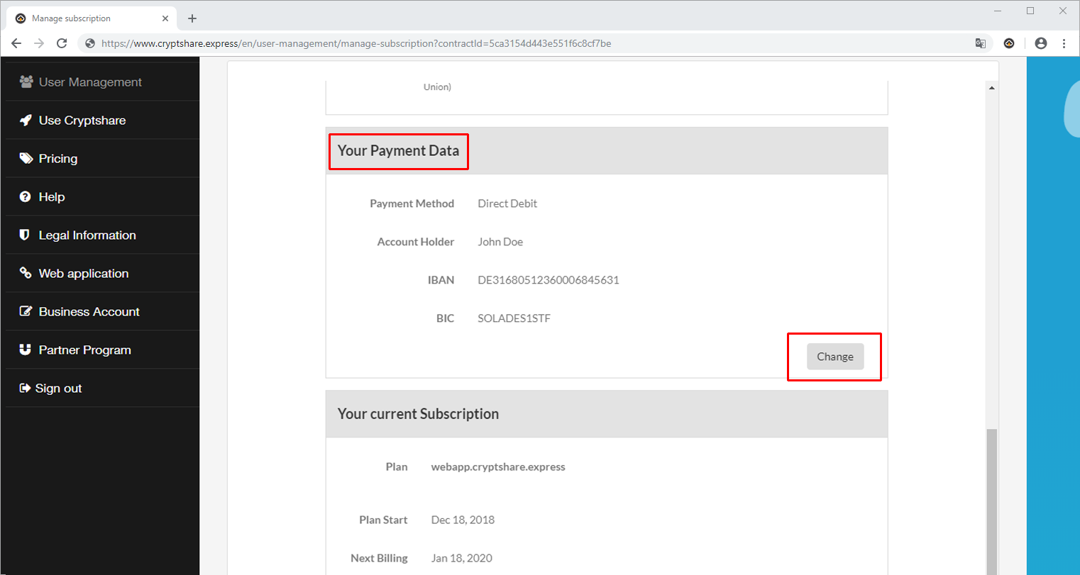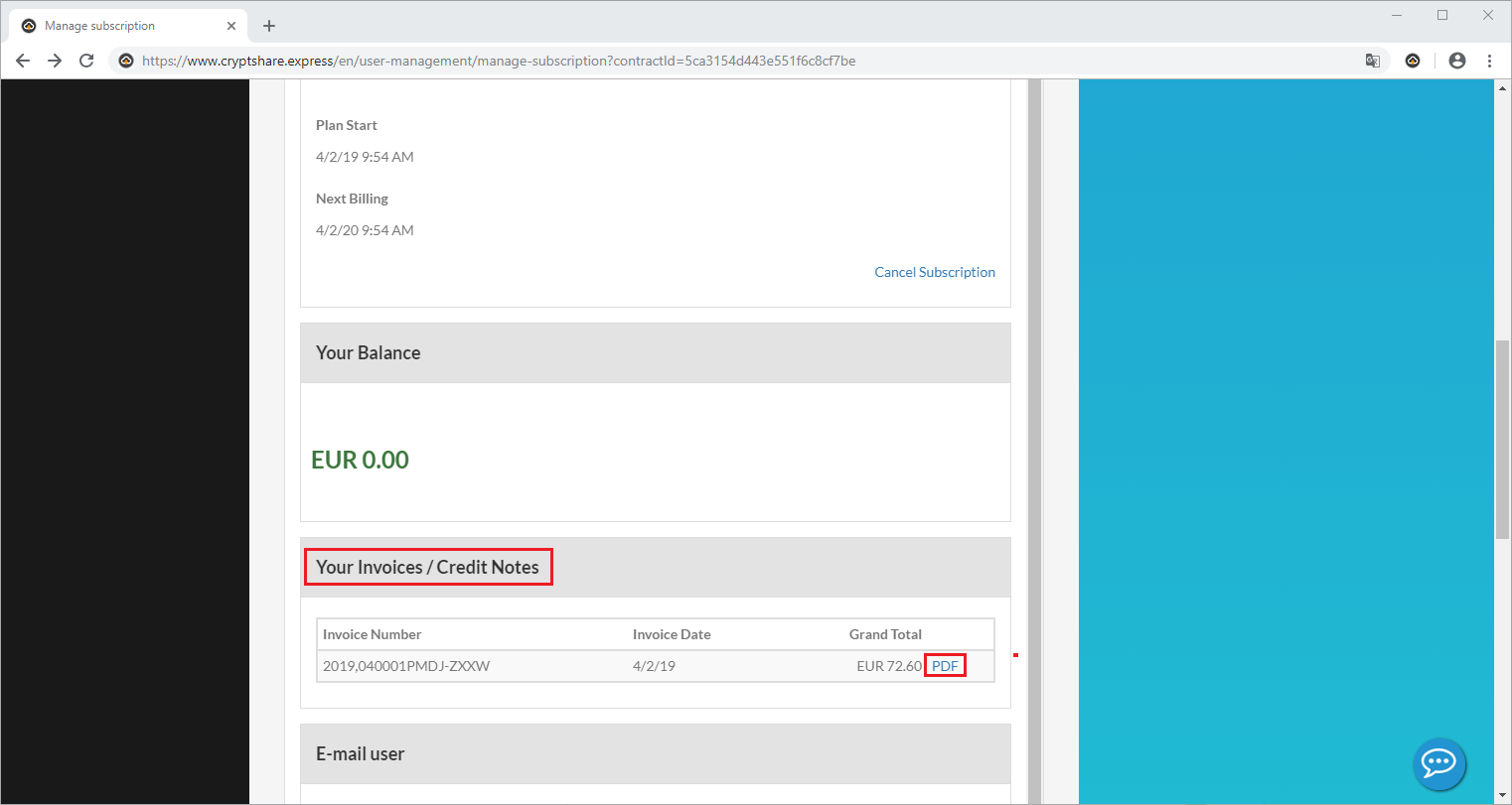 Log in with your business account and navigate to "User Management". Then click on "Manage" below the corresponding user and scroll down to the "Current subscription" section. Here you can cancel the Cryptshare.express subscription for the respective user by clicking on "Cancel subscription". Please note that you will then need to scroll up and click on the confirmation link to confirm your cancellation.
